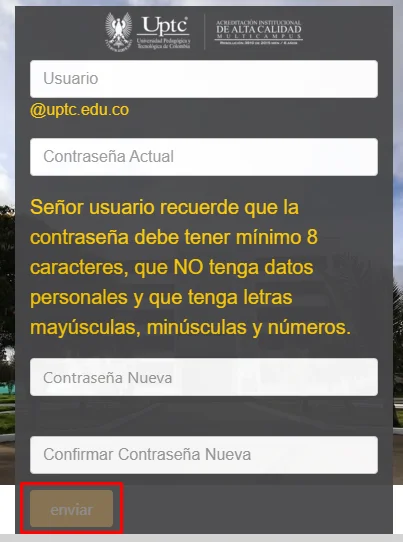 Luego, escribe el usuario sin el dominio, la contraseña utilizada para ingresar, la contraseña nueva y la confirmación de la nueva contraseña. Si todo está en orden se habilitará el botón de “Enviar”.
