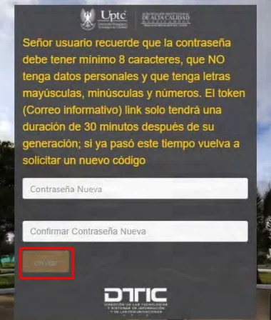 Deberás abrir el enlace en una nueva pestaña, te llevará a “Confirmación recuperación de contraseña”. Crea la nueva contraseña, confírmala y haz clic en “Enviar”