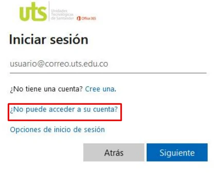 Escribe el usuario acompañado del dominio @correo.uts.edu.co y pulsa en “Siguiente”